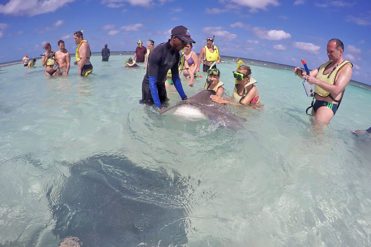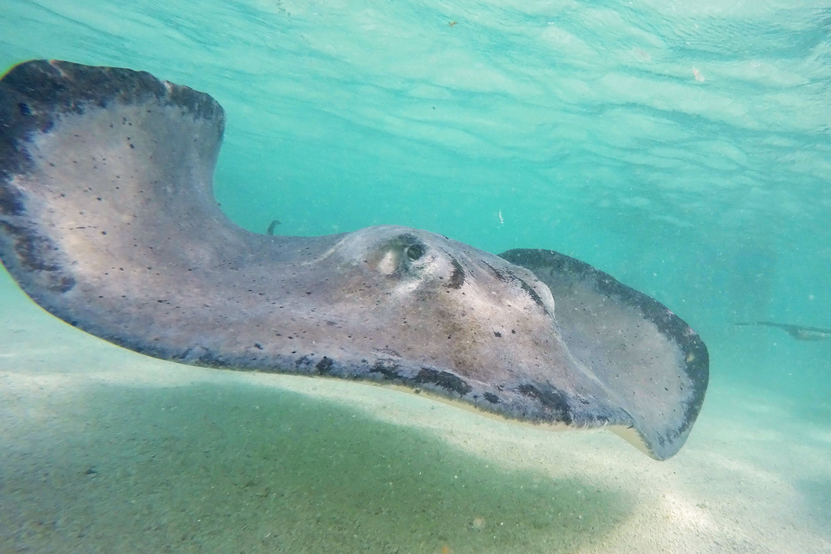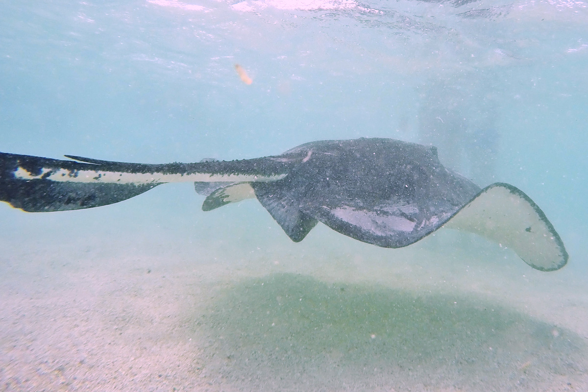 Für Mittag hatten wir einen Ausflug gebucht. Es ging mit dem Kleinbus auf die andere Seite der Insel zu einem Gebiet in dem viele Rochen leben. Mit dem Boot wurden wir zu einer Sandbank rausgefahren, wo wir mit den majestätischen Fischen schnorcheln konnten: