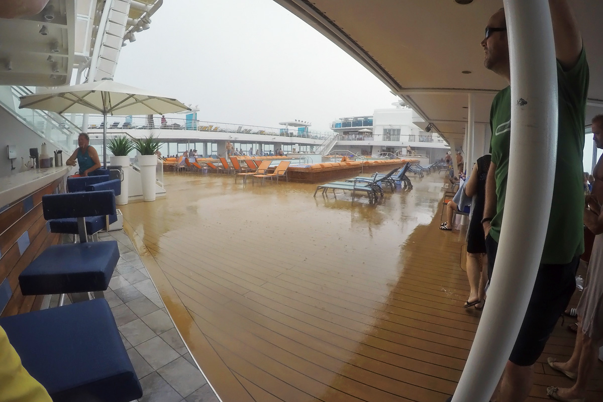 Barbados ist für einen Teil der Mitreisenden Endstation der Kreuzfahrt. Es kommen aber auch viel neue Gäste an Bord. Nach dem Auslaufen werden die neuen Gäste bei einer Poolparty an Bord begrüßt. Leider fegt genau zu dieser Zeit ein Tropenregen über das Schiff. Und wenn es in der Karibik regnet, dann auch richtig: